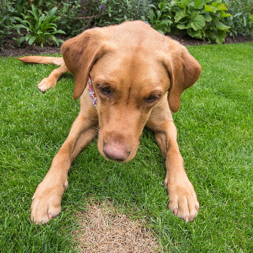 Sometimes when a dog urinates on the grass, the lawn gets damaged. There are two varieties of dog damage. The more severe damage causes spots of yellowed areas of dead grass, with darker grass surrounding it. The yellowed spot is where the grass was directly urinated on. Grass can be affected in as little as 24 hours in hot, dry weather. The central yellowed area is usually 3–6 inches, with the darker green patch surrounding it 6–12 inches.
